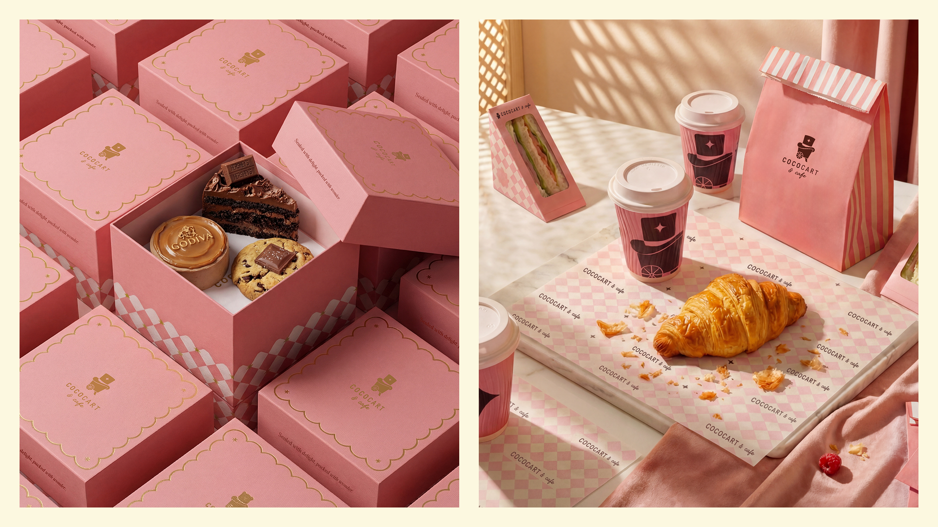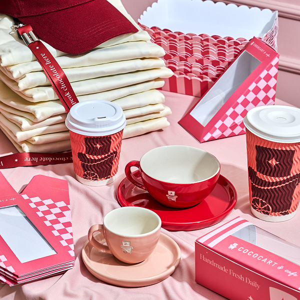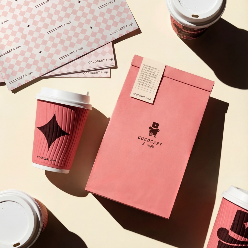 Packaging became a canvas for this new identity. Coffee cups, sleeves, cake boxes, bags, and wrapping paper were all redesigned to carry the same charm. The emblem, colours, and illustrations worked seamlessly across every item, making the entire range feel like one family. Whether someone picked up a hot chocolate in a café or a gift box in store, the experience was instantly recognisable as Cococart.